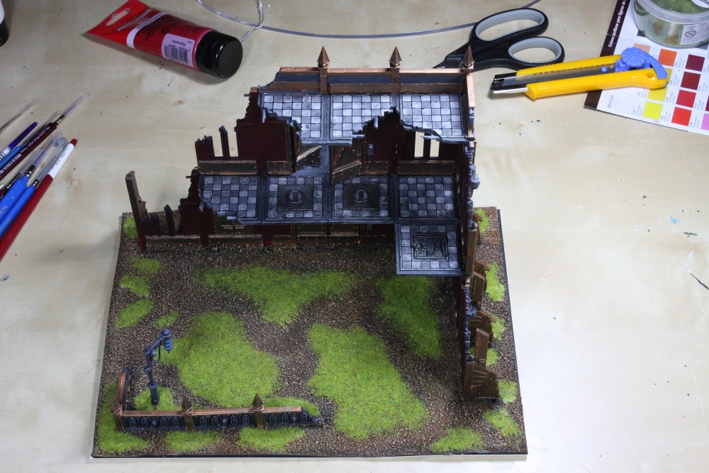 What went right? The tiles for the floor look surprisingly awesome. I'm quite happy with how those came out. I simply used a space wolf grey, and a sombre grey [from Vellejo] to get the pattern down. I threw down some bolt gun metal on the metal bits, and then took a dark wash of black and just laid it on thick. So, they look old and dirty. It's pretty awesome. I'm happy with the effect!